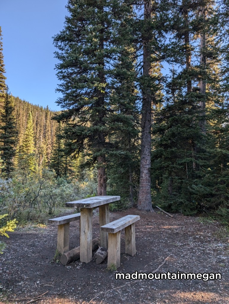 Numa creek is at the base of Numa Pass and Tumbling Pass. Between two creeks. There are a few tent pads near the creek and a few near the forest. There is one outhouse, one picnic area, and a few bear bins. The picnic tables are abnormally high. There are also several bench’s and logs to sit on. Numa also has fire pits and grills. The water source is good as it is a moving creek. Numa was wet when we were there from the rain, but talking to others who have previously been there, they say that Numa also has a lot of morning dew.