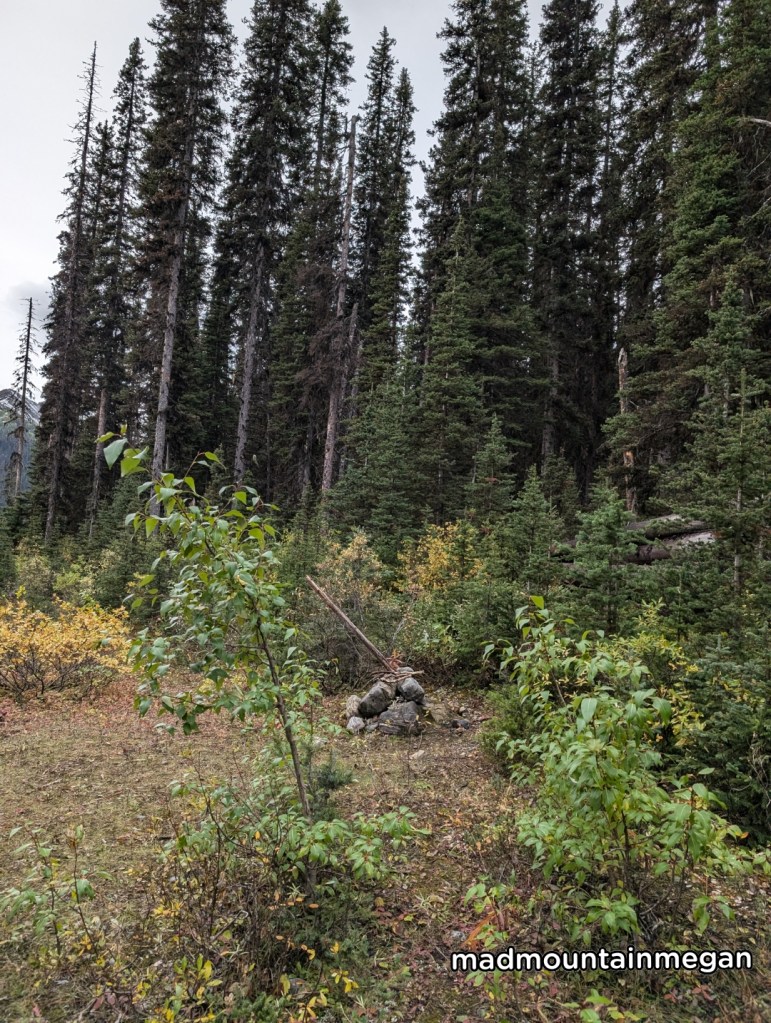 From the parking lot follow the flat path for 1.5km. As this is is the start for Smutwood Peak, you may be walking with others. Soon you will see a large pile of rocks and a stick on your right. Turn here. Follow the narrow path up the forest until you pop out in an avalanche gully. You do walk along side a creek for a short while, until it goes underground. Follow up the avalanche gully, it is steep and can be slippery. Tent ridge is to your right. Walk up the headwall, when you see larches it is close.