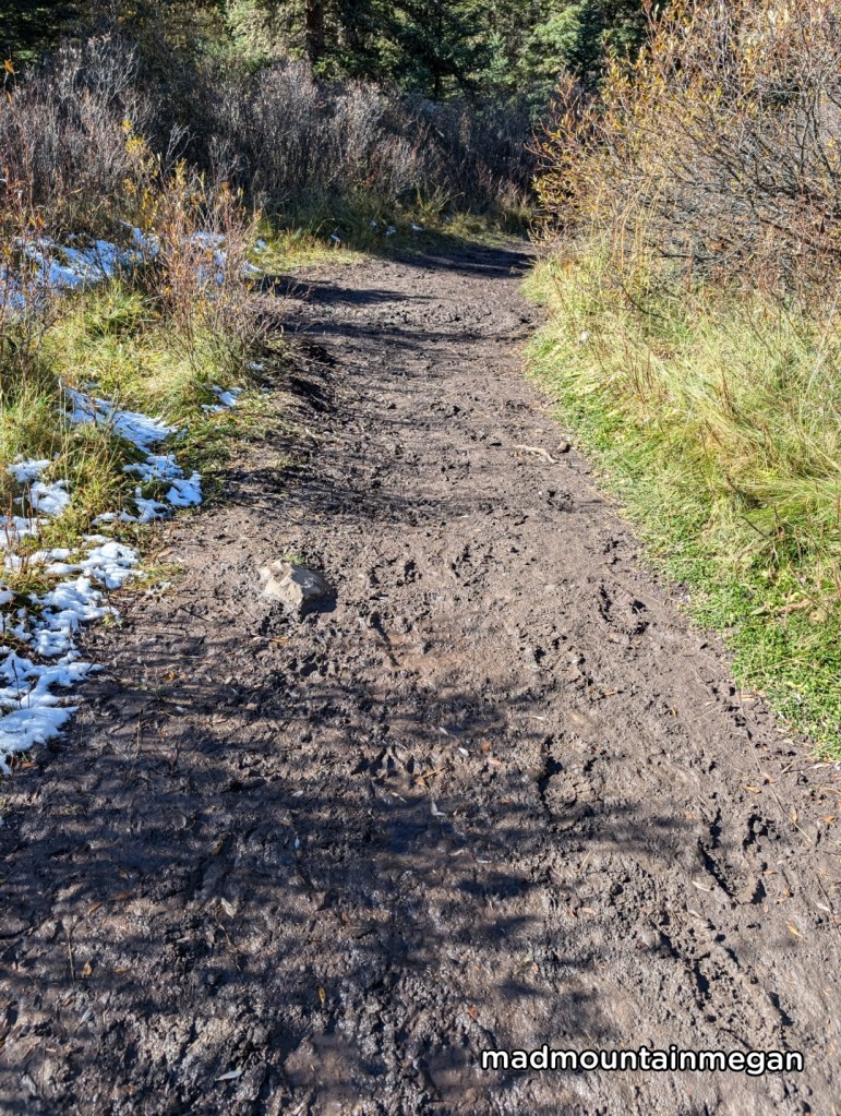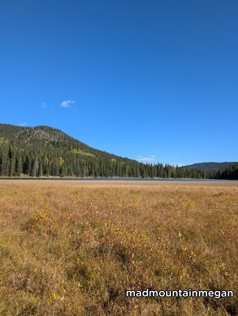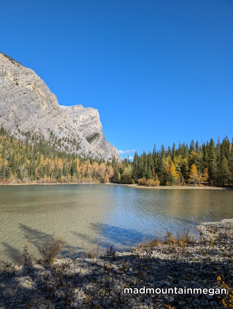 This is a trail is located on the road to the Ya Ha Tinda Ranch, it is remote and secluded. Possibly only busy on weekends. It boasts easy walking trails to a beautiful lake surrounded by mountains, yellow leaves and scenes of mountain peaks. This hike is horse, dog and child friendly.
