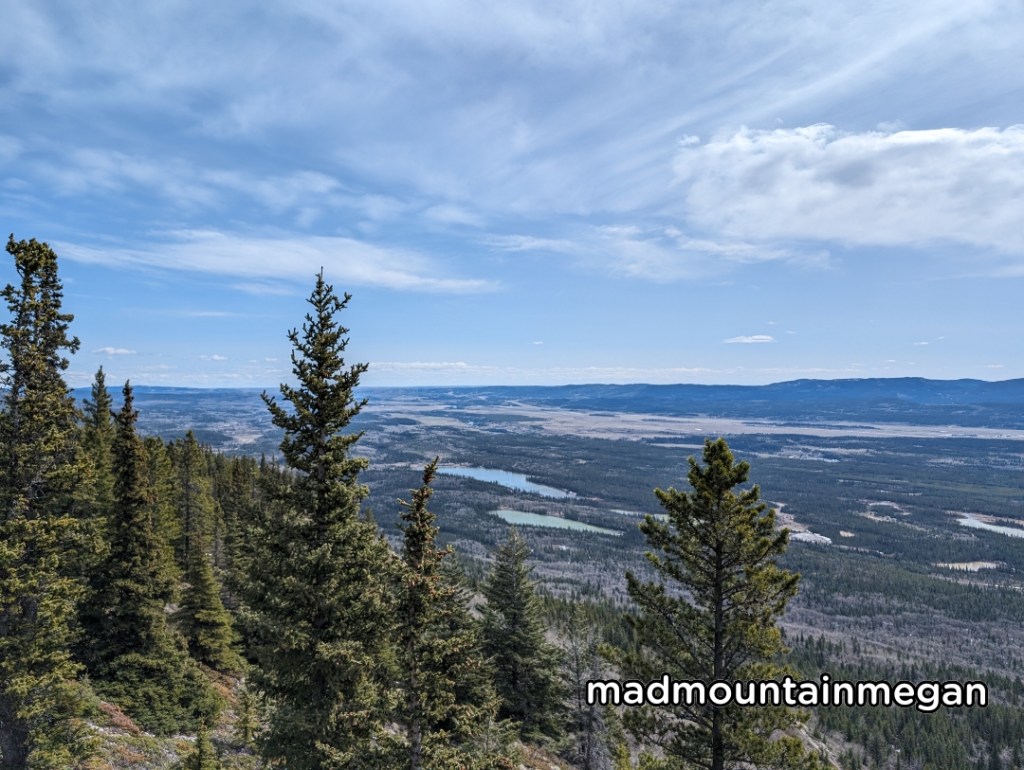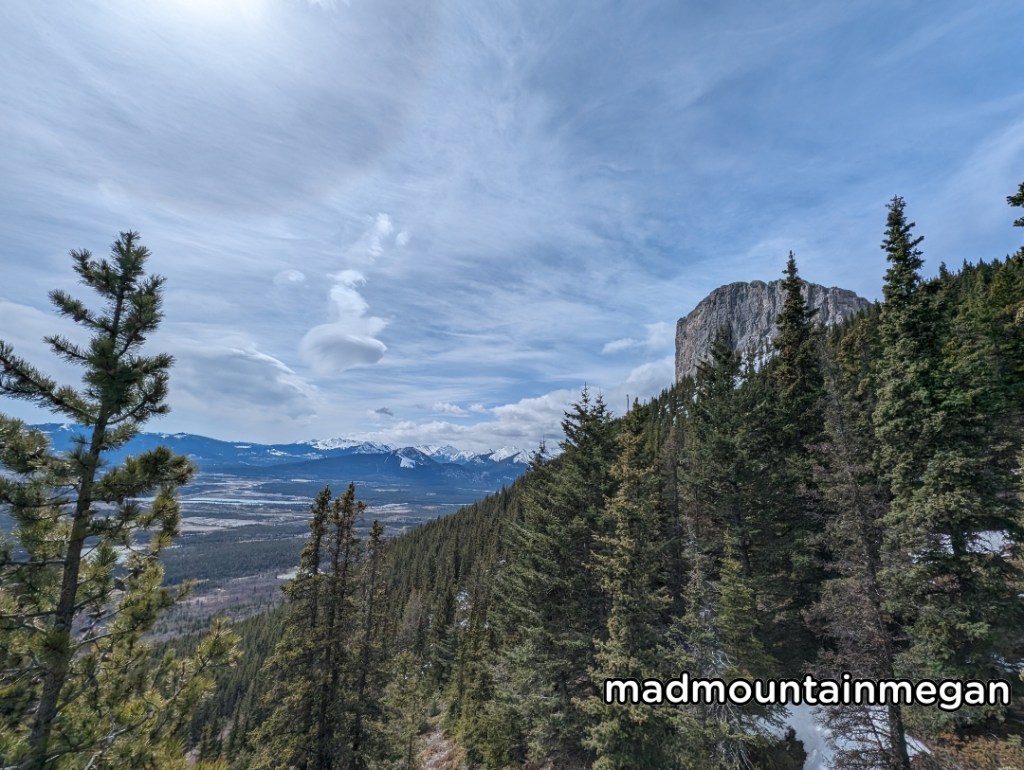 This is an official trail so the trail is very nice. Starting out through the flat forest you then approach the hill. The trial climbs and can be steep at time. There are open places to lookout at the valley below. You will then enter the trees where it is steady up again, when we came there was snow. Microspikes and poles were useful here. You then arrive to the top of Ravens End. There is a sign here, and you can see where the Mount Yamunska trail then begins. From the top you there are a lot of trees but you can find spots to lookout at the valley below, but also we the mountains behind Yamunuska.