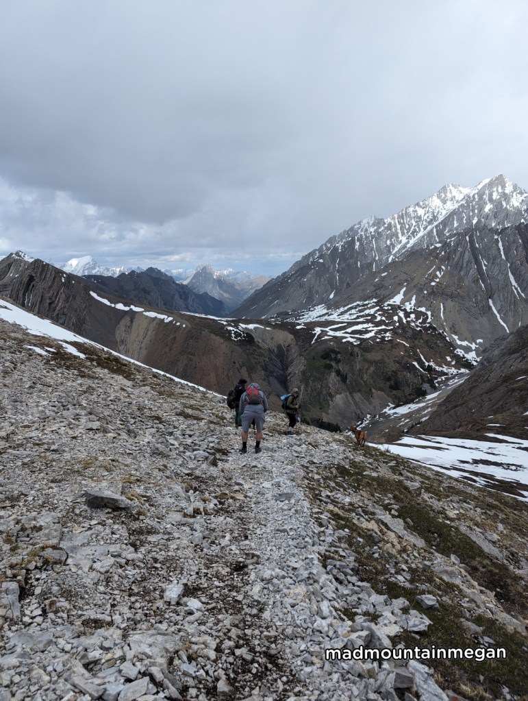 This hike starts steep and continues this way the whole hike. You begin in the forest until you are in an open area with a headwall. Climbing the headwall can be difficult but it is flagged and has many hand holds. Our two dogs did it no problem, but plan ahead if you are bringing dogs. The path slightly flattens while you turn around the mountain. The trail gets a little confusing on the back side as its been made into multiple trails. Basically you need to aim for the saddle ahead of you. You will cross a couple avalanche paths and this is where the snow holds in shoulder season. You then come to the back end of the saddle and it can be icy and slippery on the mud. Cresting the saddle you now turn left to look at the peak, snow holds here as well. Hike up the grassy side to reach the peak. It is quite windy but you are greeted with views of the valley below.
