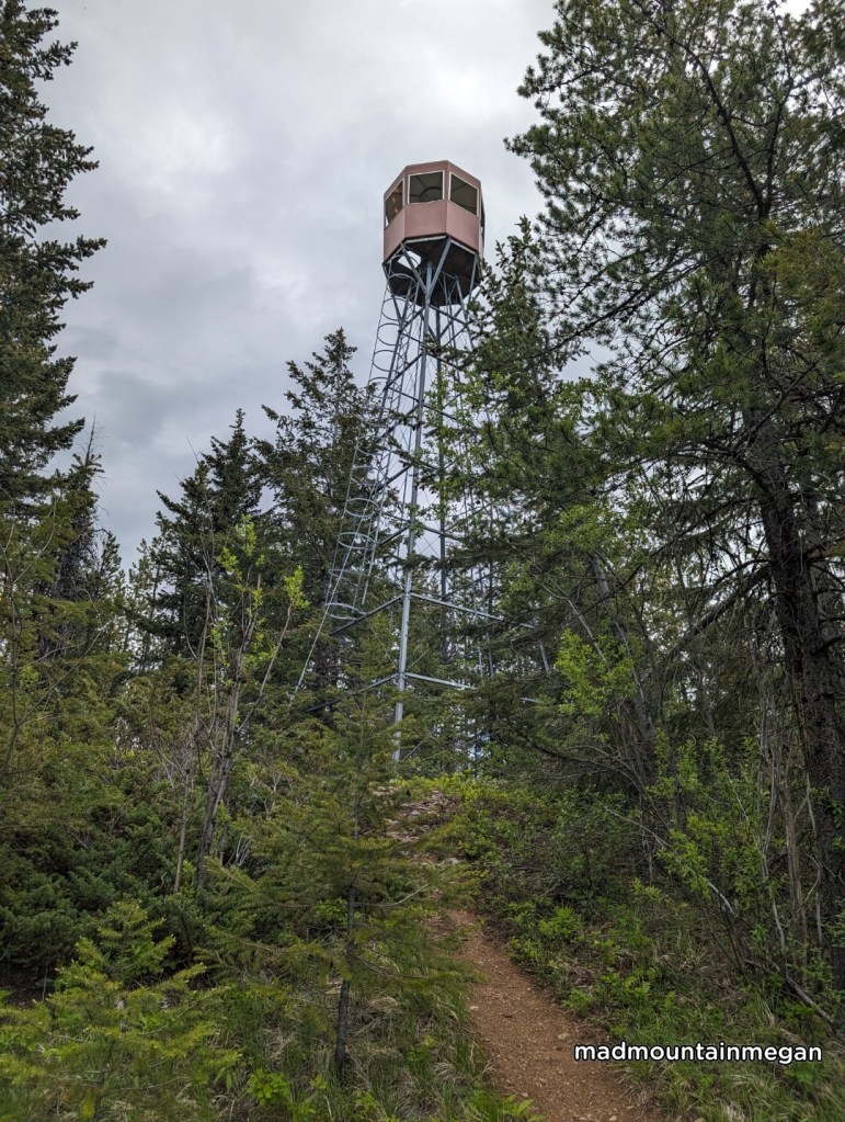 From the parking lot cross Highway 1. Be extremely careful, this Highway is busy and people go fast. The trail starts out mellow through the trees until you cross train tracks. Also be careful crossing the tracks and if a train is passing stand in the forest, trains will throw rocks. The incline starts, steady and steep up hill. The path is very nice as its an official trail. There are not many views going up and is mainly in the trees. You will reach a fork in the road with a sign. Turn left for the fire lookout. Turning right will take you to the upper lookout, which we did not do. The trail somewhat flattens out as you reach the lookout. You are unable to climb the lookout tower as they cut the ladder but you can still go in the lookout cabin. The lookout cabin has seats, but does have a lot of mouse poop inside. The view from the top is of the valley Wapta Falls sits in and you can see the Highway 1 valley.