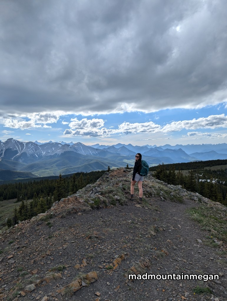 The hike starts in the forest, it is a gentle up with some switchbacks. The path is well beaten and wide, not very technical. You soon reach the top of the hill and a T intersection, turn left. Following the ridge. You leave the trees and are now on a wide open area. There are many flowers in this meadow. Head up the hill. Once you reach the summit you can see Calgary, Moose Mountain and other mountains in the Bragg creek area.