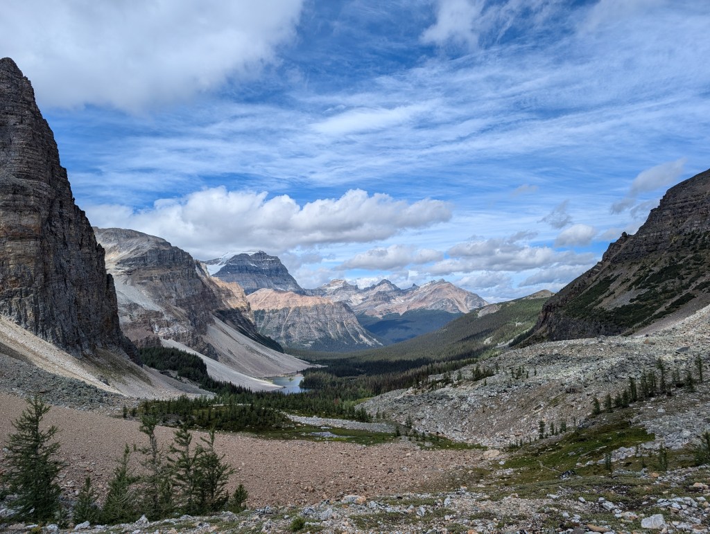 Starting from the campground you climb steady up the headwall, until you reach a open alpine forest. From here you can see Pharaoh Peak Hike on your right. Yes it is straight up that avalanche gully with the pointy rocks. We continued on to the pass and had lunch at a large rock. On the way down you have the option to visit Scarab lake which is a beautiful blue color.